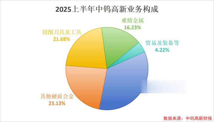 2025年上半年,中钨高新前三大业务分别是精矿和粉末制品、其他硬质合金、切削刀具及工具,其中精矿及粉末制品贡献了27.27亿元的营收,占比达到34.74%。