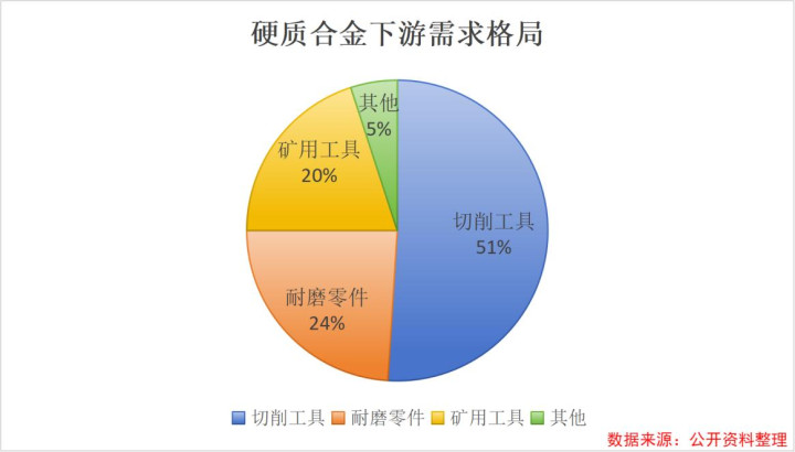 硬质合金下游需求主要来自切削工具、耐磨工具和矿用工具,三者加起来占比超过90%。其中切削工具为硬质合金下游第一大需求领域,占比达到51%。
