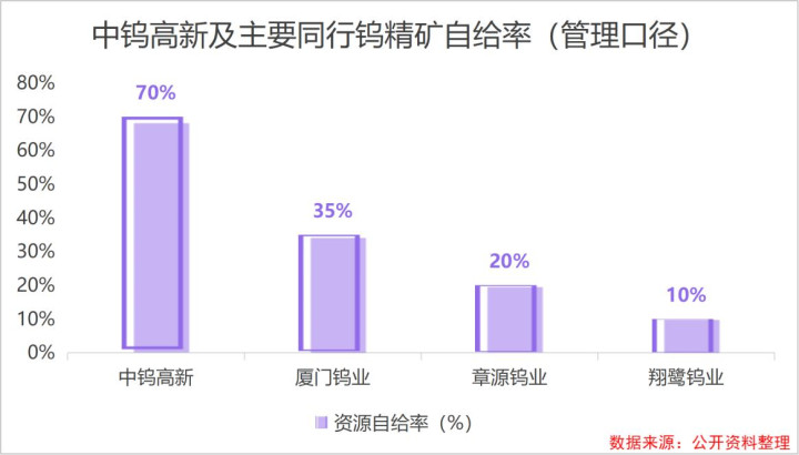 这就使得中钨高新的钨精矿自给率在70%以上,显著高于同行业其他公司。