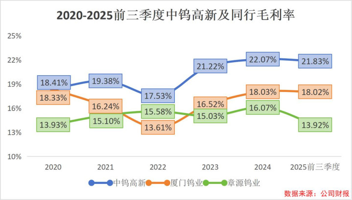 2025年前三季度,中钨高新毛利率达到21.83%,而同行厦门钨业和章源钨业的毛利率则分别仅为18.02%和13.92%。